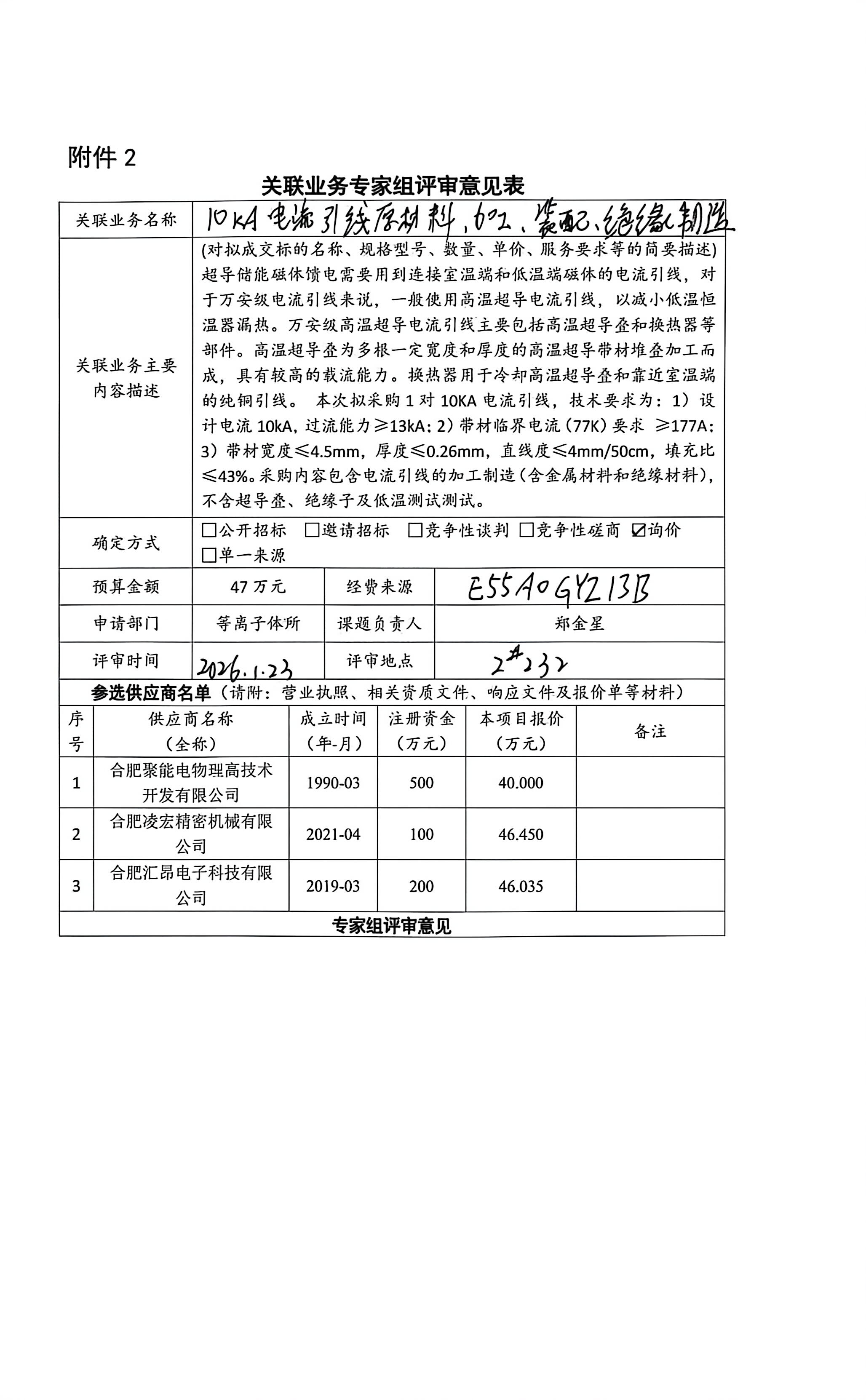 中国科学院合肥物质科学研究院等离子体物理研究所郑金星老师委托合肥聚能电物理高技术开发有限公司进行10KA电流引线原材料、加工、装配、绝缘制造。该电流引线应用于超导储能磁体馈电中连接室 温端和低温端磁体,以减小低温恒温器漏热。该万安级高温超导电流引线主要包括高温超导叠和换热器等部件,高温超导叠为多根一定宽度和厚度的高温超导带材堆叠加工而成,预期 具有较高的载流能力,换热器用于冷却高温超导叠和靠近室温端的纯铜引线。合肥聚能电物理高技术开发有限公司股东之一为合肥科学岛控股有限公司,该公司在其中占股35%,本次构成关联业务交易。