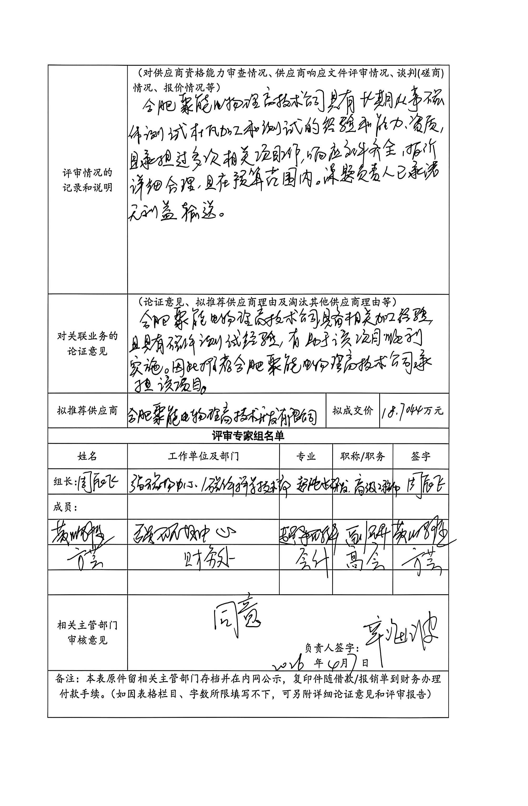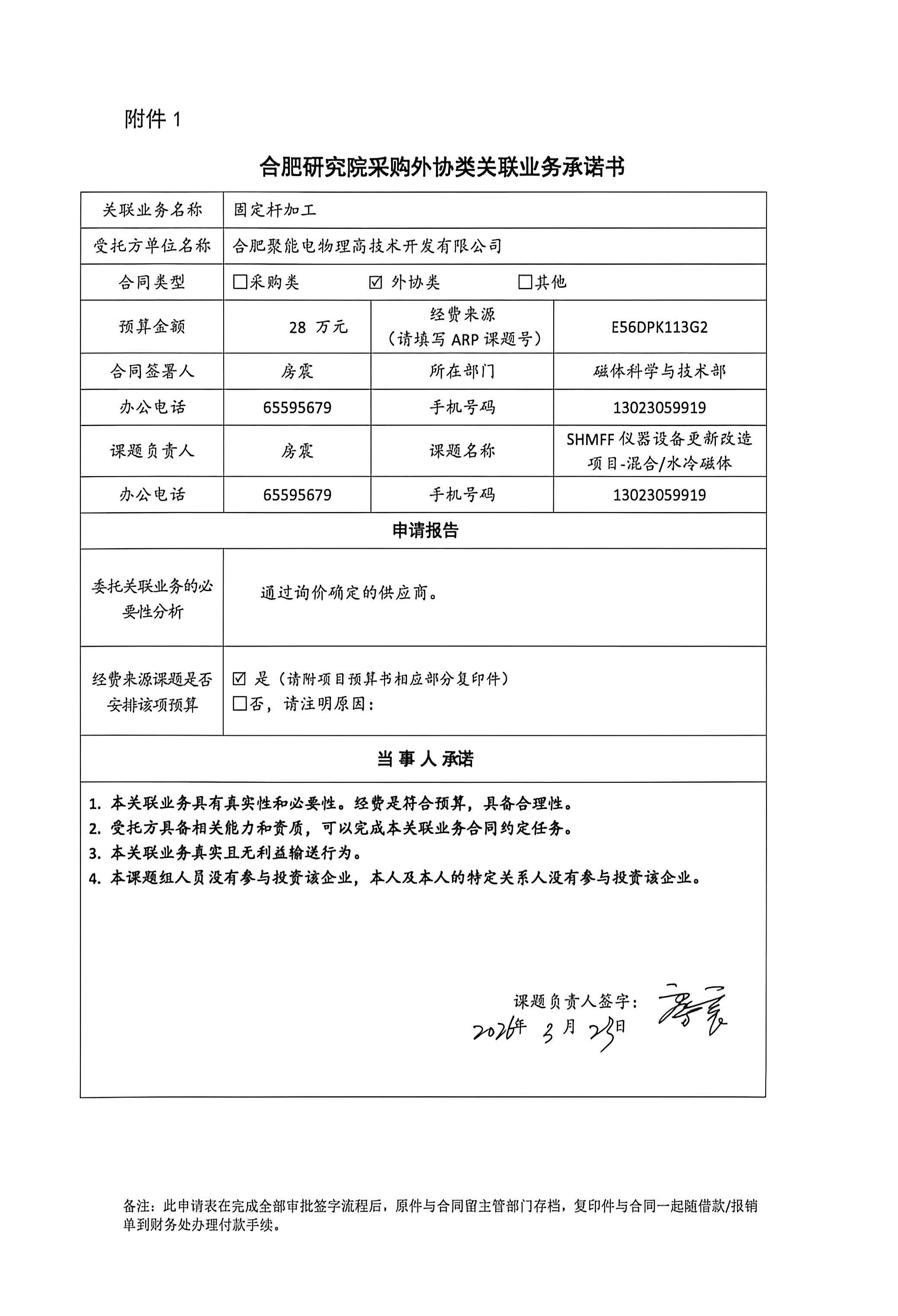 根据《中国科学院关于加强科研项目关联业务管理的暂行规定》(科发条财字〔2015〕125号)、《中国科学院合肥物质科学研究院关于加强科研项目关联业务管理的实施细则》(科合院发资字〔2021〕8号)、《合肥研究院加强关联业务管理暂行办法》(科合院发资字〔2022〕 1号)、《合肥物质院加强关联业务管理补充规定》(科合院发资字〔2025〕1号)要求,现就我院委托合肥聚能电物理高技术开发有限公司进行固定杆加工的关联业务做公示。