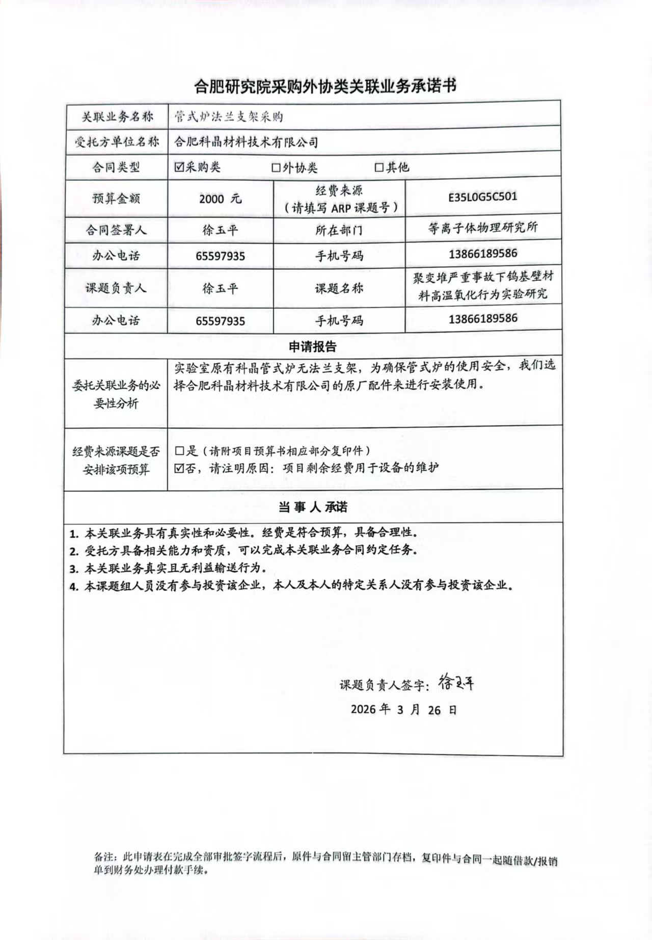 根据《中国科学院关于加强科研项目关联业务管理的暂行规定》(科发条财字〔2015〕125号)、《中国科学院合肥物质科学研究院关于加强科研项目关联业务管理的实施细则》(科合院发资字〔2021〕8号)、《合肥研究院加强关联业务管理暂行办法》(科合院发资字〔2022〕1号)、《合肥物质院加强关联业务管理补充规定》(科合院发资字〔2025〕1号)要求,现就我院从合肥科晶材料技术公司采购管式炉法兰支架做关联业务公示。