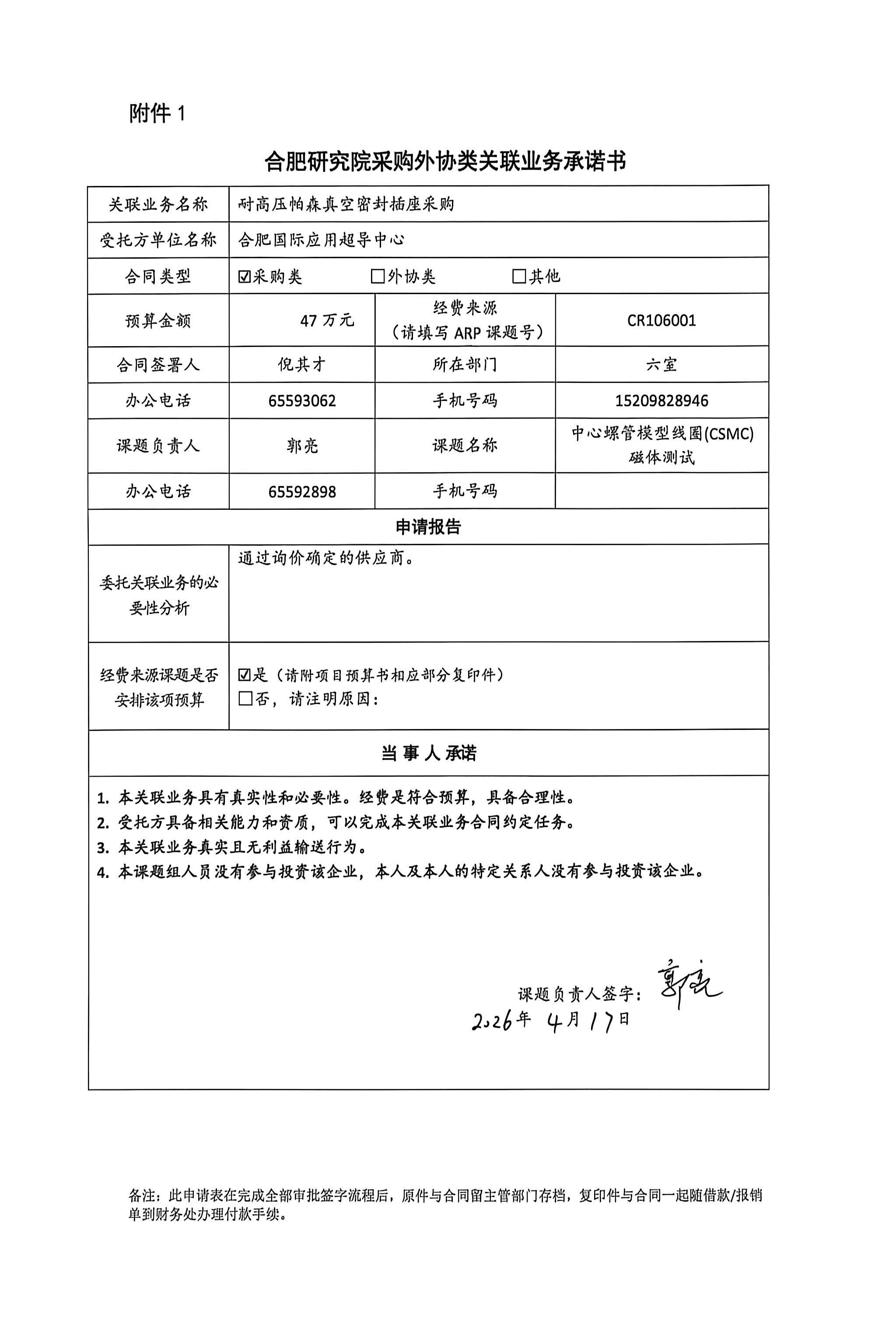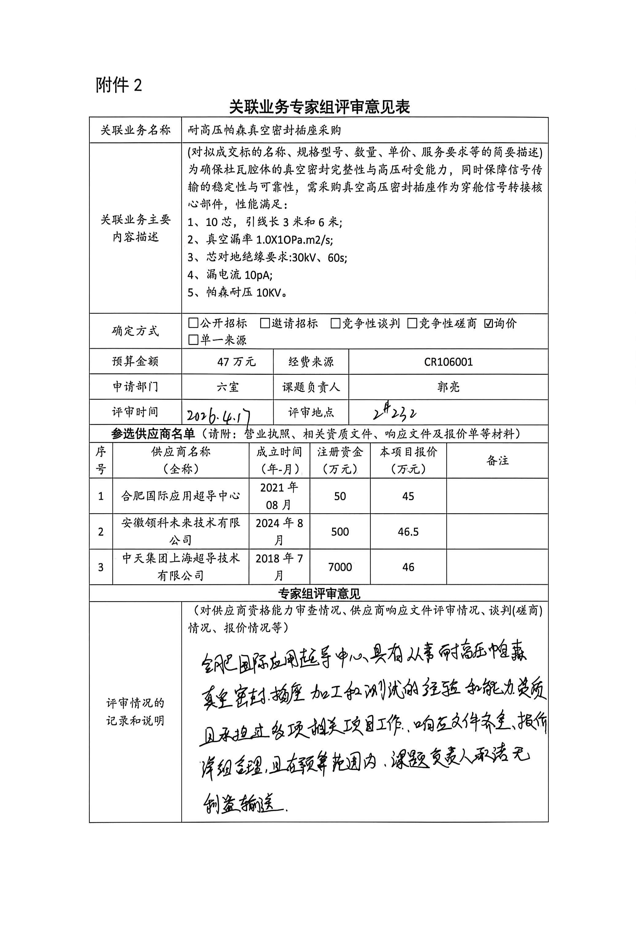 根据《中国科学院关于加强科研项目关联业务管理的暂行规定》(科发条财字〔2015〕125号)、《中国科学院合肥物质科学研究院关于加强科研项目关联业务管理的实施细则》(科合院发资字〔2021〕8号)、《合肥研究院加强关联业务管理暂行办法》(科合院发资字〔2022〕1号)、《合肥物质院加强关联业务管理补充规定》(科合院发资字〔2025〕1号)要求,现就我院从合肥国际应用超导中心采购耐高压帕森真空密封插座做关联业务公示。