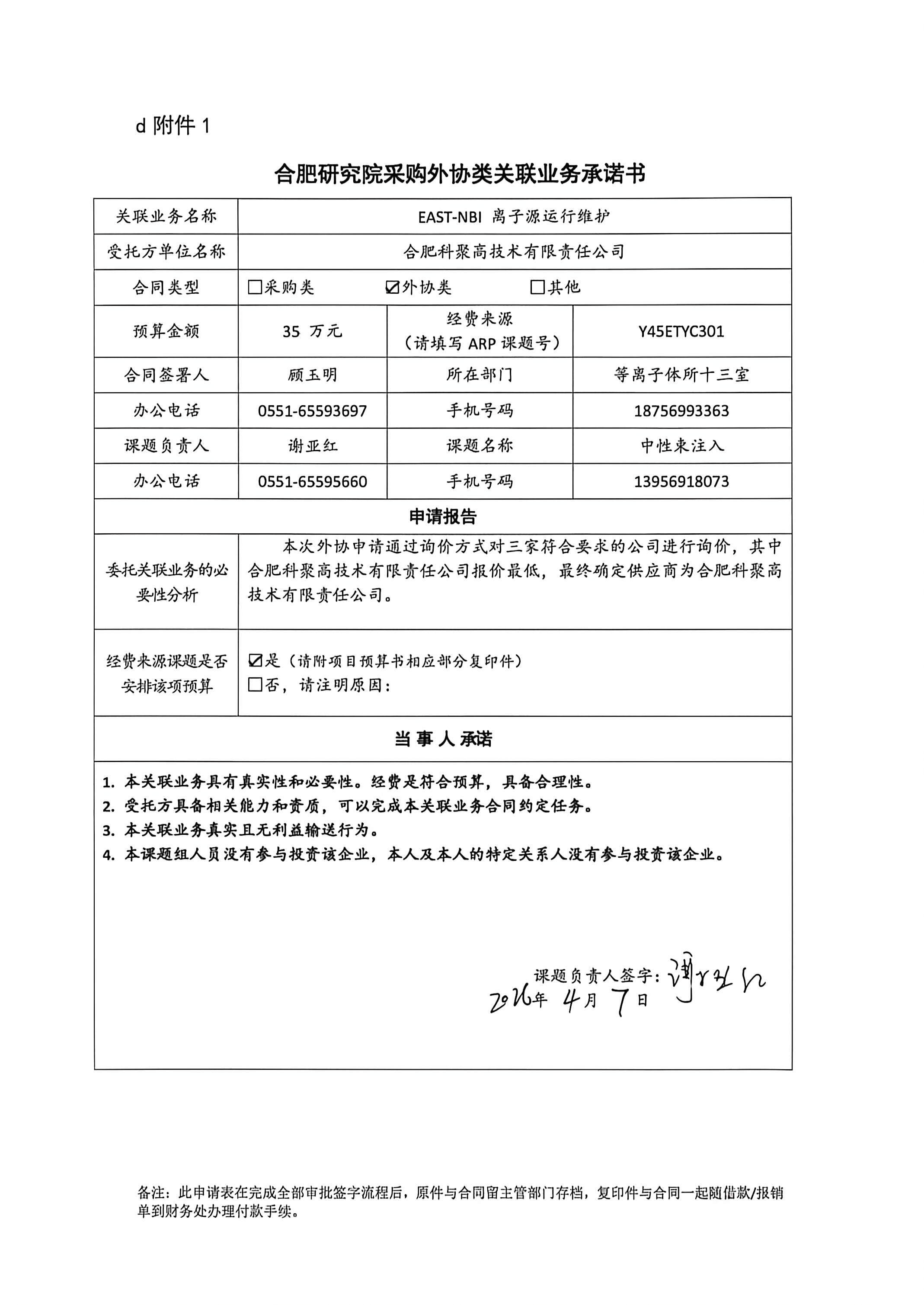 中国科学院合肥物质科学研究院等离子体物理研究所谢亚红老师委托合肥科聚高技术有限责任公司进行EAST-NBI离子源运行维护。该项目主要工作内容如下:离子源系统水路运行维护,离子源放电室组装与维护和离子源加速器组装及维护,以及根据实验计划参与测试台与EAST实验运行任务。合肥科聚高技术有限责任公司自然人股东包括合肥科学岛控股有限公司,持股比例100%,本次采购构成关联业务交易。
