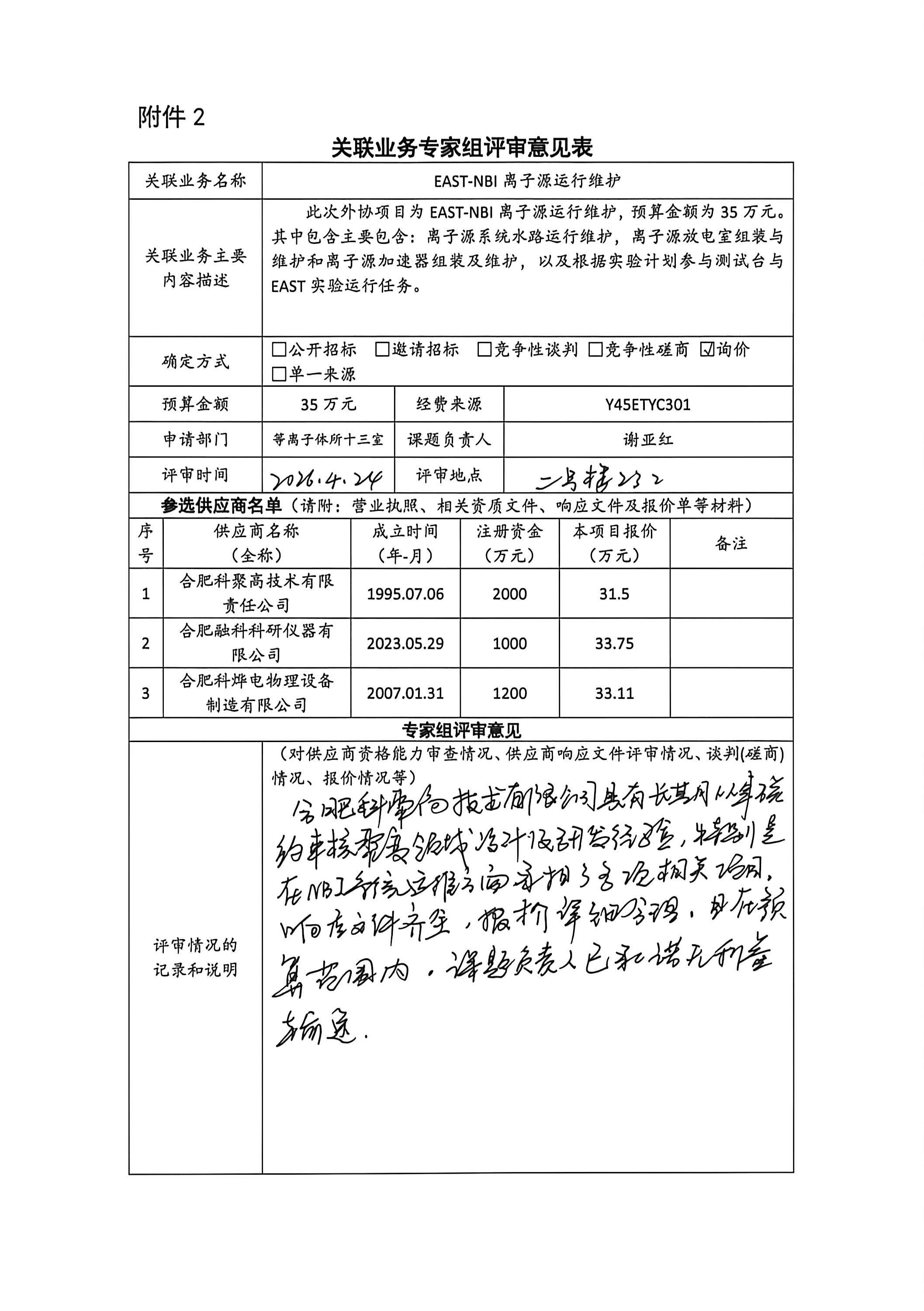 根据《中国科学院关于加强科研项目关联业务管理的暂行规定》(科发条财字〔2015〕125号)、《中国科学院合肥物质科学研究院关于加强科研项目关联业务管理的实施细则》(科合院发资字〔2021〕8号)、《合肥研究院加强关联业务管理暂行办法》(科合院发资字〔2022〕1号)、《合肥物质院加强关联业务管理补充规定》(科合院发资字〔2025〕1号)要求,现就委托合肥科聚高技术有限责任公司进行EAST-NBI离子源运行维护的关联业务做公示。