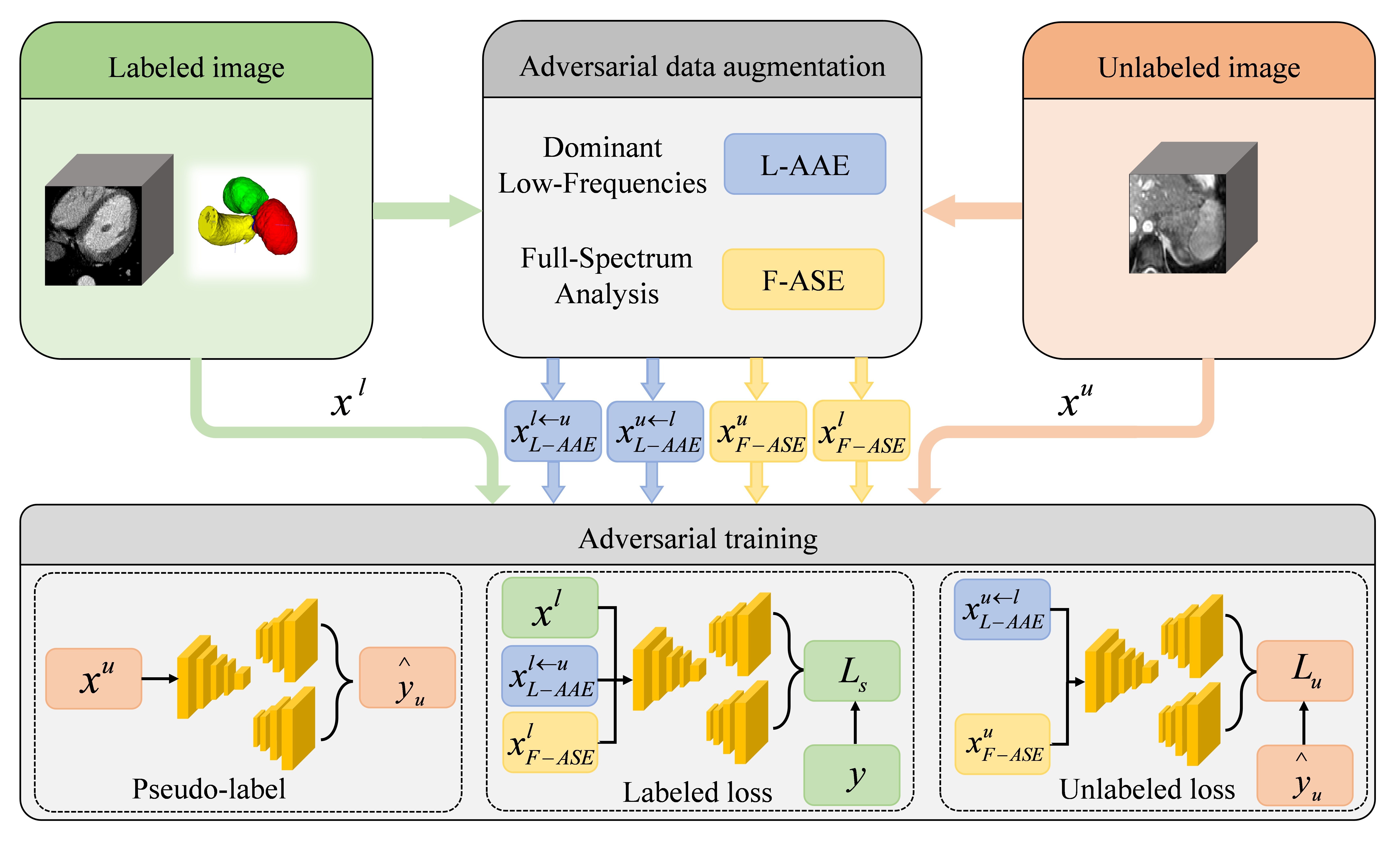 针对以上痛点,研究团队创新提出抑制频率捷径的新思路,依托对抗训练架构,设计两种全新的数据增强模块,从数据层面限制模型的有偏见学习问题,全面提升模型的泛化与适配能力。一是低频对抗自适应增强模块(L-AAE),避免模型过度依赖单一主流频率特征,同时通过双向对抗调整与风格优化,缩小不同来源医学影像的数据差异。二是进一步提出了频率自适应抑制增强模块(F-ASE),动态调节图像不同频率的特征权重,引导模型全面学习各类频率信息,减少对特定特征的过度依赖。最后,将原始影像与优化后的对抗样本结合,融入半监督学习体系开展训练。团队在相关 SSL、UDA 和 Semi-DG 等多项公开标准数据集上完成大量对比实验,充分验证了该方法的先进性与实用性。