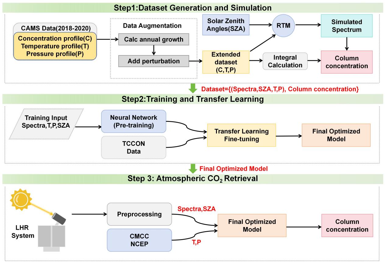 大气二氧化碳(CO2)作为最主要的温室气体之一,其高精度监测对于全球碳收支评估和气候变化研究具有重要意义。激光外差辐射计(LHR)因具有高光谱分辨率、体积小和成本低等优势,被认为是地基温室气体柱浓度观测的重要技术手段。然而,传统基于全物理模型的反演方法依赖先验浓度廓线且计算复杂,需要反复调用辐射传输模型,导致计算成本高、实时性差,并易受初值影响产生偏差。