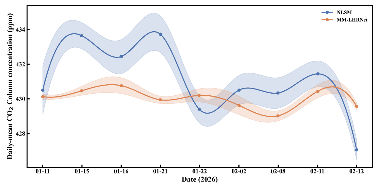 MM-LHRNet与NLSM反演的CO2柱浓度日均时间序列图。圆点表示日均值,阴影区域表示均值±1σ范围