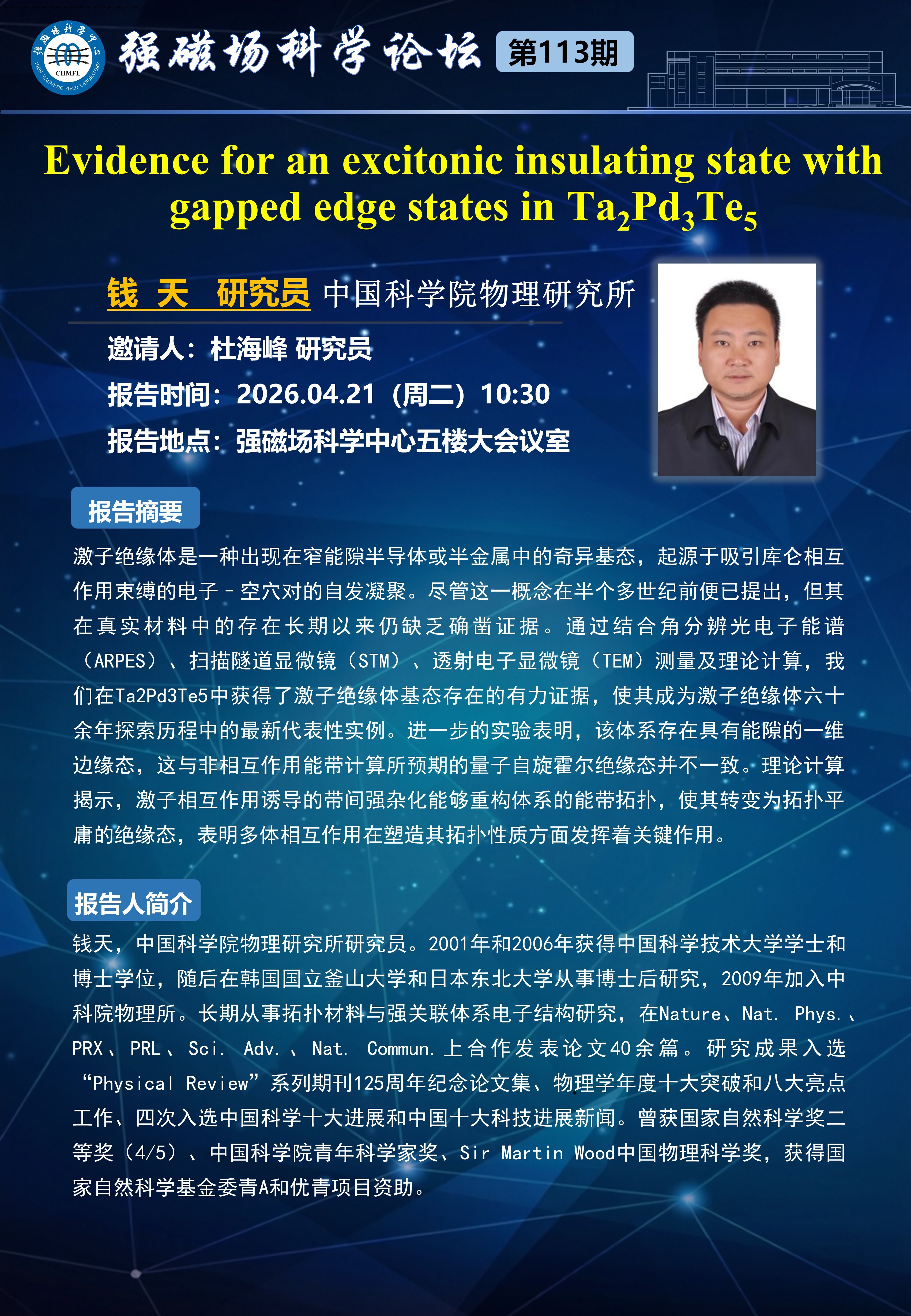 【04.21】学术报告:Evidence for an excitonic insulating state with gapped edge states in Ta₂Pd₃Te₅