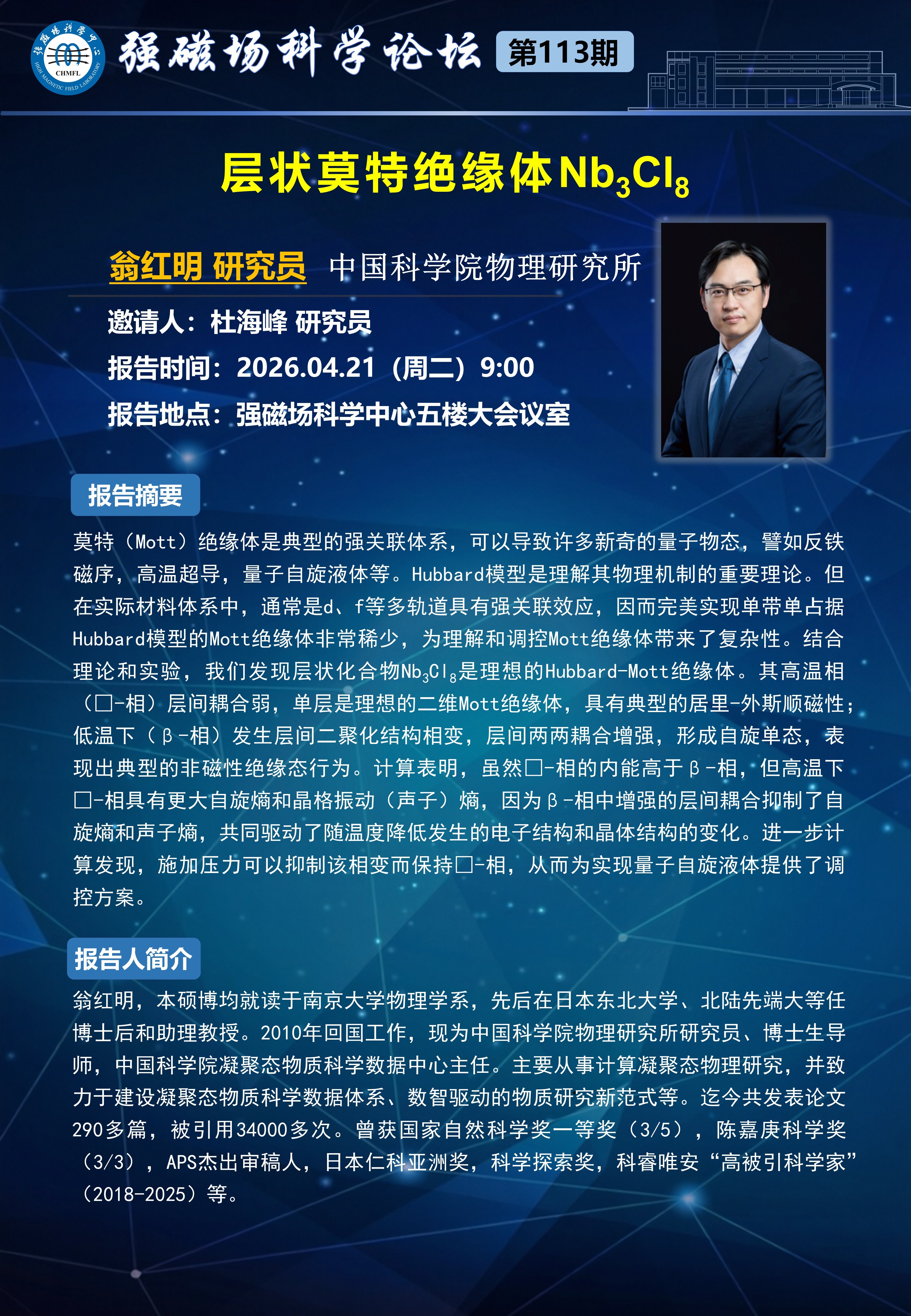 【04.21】学术报告:层状莫特绝缘体Nb₃Cl₈