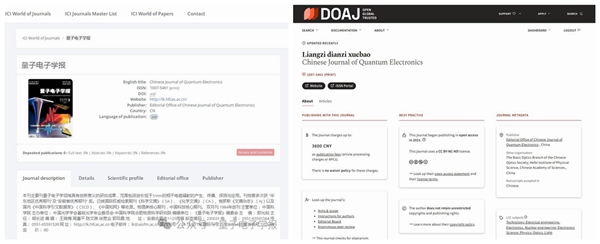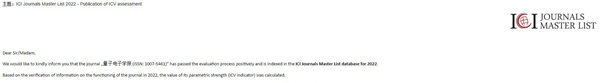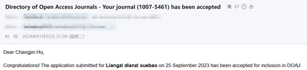 1月2日,由中国科学院合肥物质院和中国光学学会基础光学专业委员会联合主办的《量子电子学报》被DOAJ(瑞典)数据库成功收录。2023年11月,《量子电子学报》已被ICI Journals Master list(波兰)数据库收录。