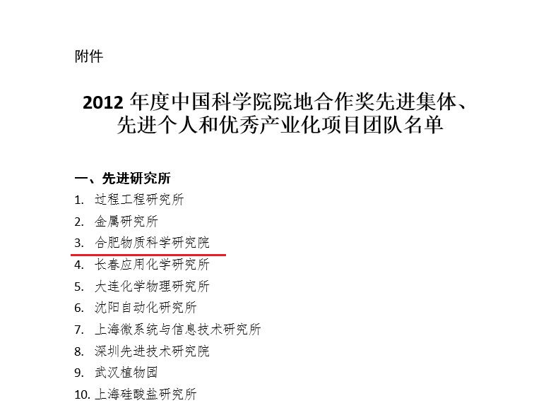 日前,根据《中国科学院关于表彰2012年度中国科学院院地合作奖先进集体、先进个人和优秀产业化项目团队的通报》,合肥研究院名列中国科学院院地合作奖先进研究所第三名。