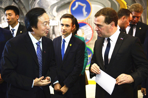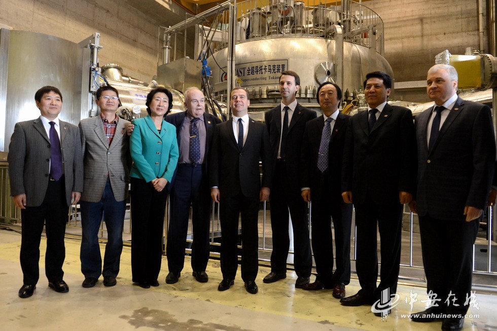 10月23日中午,应邀来华访问的俄罗斯总理梅德韦杰夫莅临中国科学院合肥物质科学研究院等离子体物理研究所,从此地开始了他的合肥科技之旅。俄罗斯驻华特命全权大使安德烈•杰尼索夫、库尔恰托夫研究所所长Evgeny Velikhov院士、中国外交部副部长程国平、中国驻俄罗斯大使李辉、安徽省副省长花建慧等陪同访问。合肥研究院副院长、等离子体所所长李建刚接待了来宾。