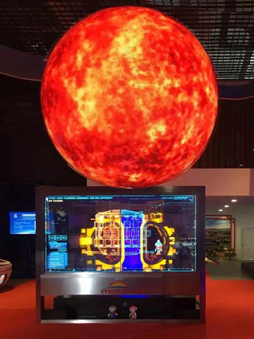 “中国核聚变能源开发与ITER计划”展项是2017年阿斯塔纳世博会中国馆的核心展项,它由透明互动主屏和侧屏、直径3米的LED球、直径2.4米的ITER装置模型三个部分组成。内容包括核聚变科普、中国核聚变领域的科研技术成果及人才储备、中国在ITER计划中承担的任务及贡献,中国核聚变能源开发的历史进程,以及中国梦、能源梦、一带一路等内容。展项表现出“中国要对人类作出更大的贡献”的理想抱负,在世界树立“中国聚变”的品牌形象。