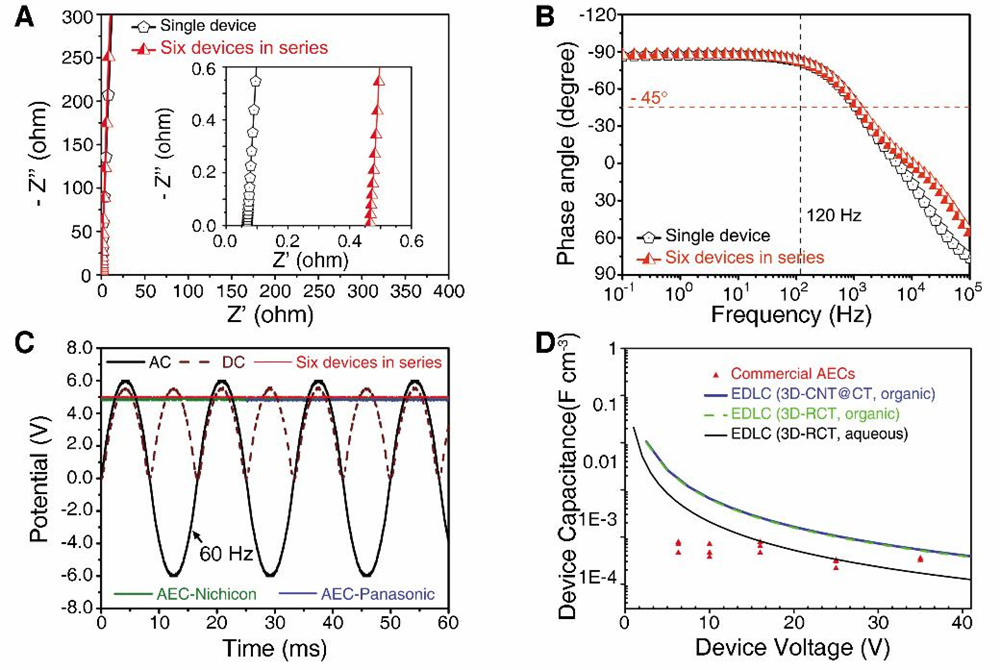 图3. 六个基于三维互连碳管网格膜的电容器串联后的阻抗(A)、频率响应(B)、滤波性能(C),以及与相同额定电压下的铝电解电容器的体积比电容比较(D)。