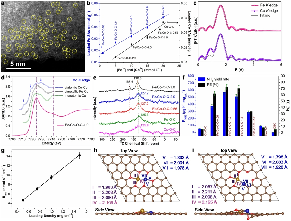 图1. (a) Fe/Co-O-C-1.0样品的球差校正的HADDF-STEM图; (b) Fe-O-C、Co-O-C和Fe/Co-O-C-r上负载的Fe和Co-SA含量与初始加入的Fe3+和Co2+浓度的线性图;(c) Fe/Co-O-C-1.0样品Fe K边和Co K边的R空间EXAFS拟合光谱图;(d) Fe/Co-O-C-1.0样品的Co K边XANES光谱图和理论计算模拟(FEFF8.4)得到的双原子Co-Co、单原子Co和双原子Fe-Co的XANES光谱图对比;(e) Co-O-C、Fe-O-C,Fe/Co-O-C-0.56,Fe/Co-O-C-2.9和Fe/Co-O-C-1.0的13C 固体核磁图谱;(f) Fe-O-C、Co-O-C、纯BC碳化得到的CBC和Fe/Co-O-C-r负载于玻碳电极上(3.0 mm直径,负载量:0.50 mg cm-2)在-0.30 V (vs. RHE) 对应的氨产率和法拉第效率;(g) 玻碳电极上(1.0 ×1.0 cm2)Fe/Co-O-C-1.0的负载密度对几何面积活性的影响;(h) 石墨碳上优化的[(O-C2)3Fe-Co(O-C2)3]结构;(i) 石墨碳上优化的[(O-C2)3Fe-Co(O-C)C2]结构。