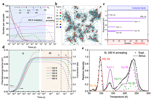 为解决这些问题,研究团队打破传统的单维度分析方法,构建了基于第一性原理的多尺度模型框架,突破了非平衡缺陷精准鉴定和DLTS准确模拟的两大技术瓶颈,成功实现了辐照半导体中深能级缺陷的多维度鉴定及其演化机理揭示。团队首先运用该方法成功鉴定了中子辐照硅中的深能级缺陷,验证了方法的可靠性。并进一步鉴定了中子辐照第三代半导体4H-SiC中的深能级缺陷,解决了其原子起源的长期争议。研究还发现,由于不同温度下的缺陷动力学行为不同,缺陷类型会随着退火温度的变化而显著改变,这一发现颠覆了长期以来基于静态缺陷理论的认知。该工作有力推动了半导体非平衡缺陷理论的发展,并为半导体材料和器件性能的调控提供了重要指导,有望应用于抗辐照电子器件和固态量子比特设计等国家重点领域。