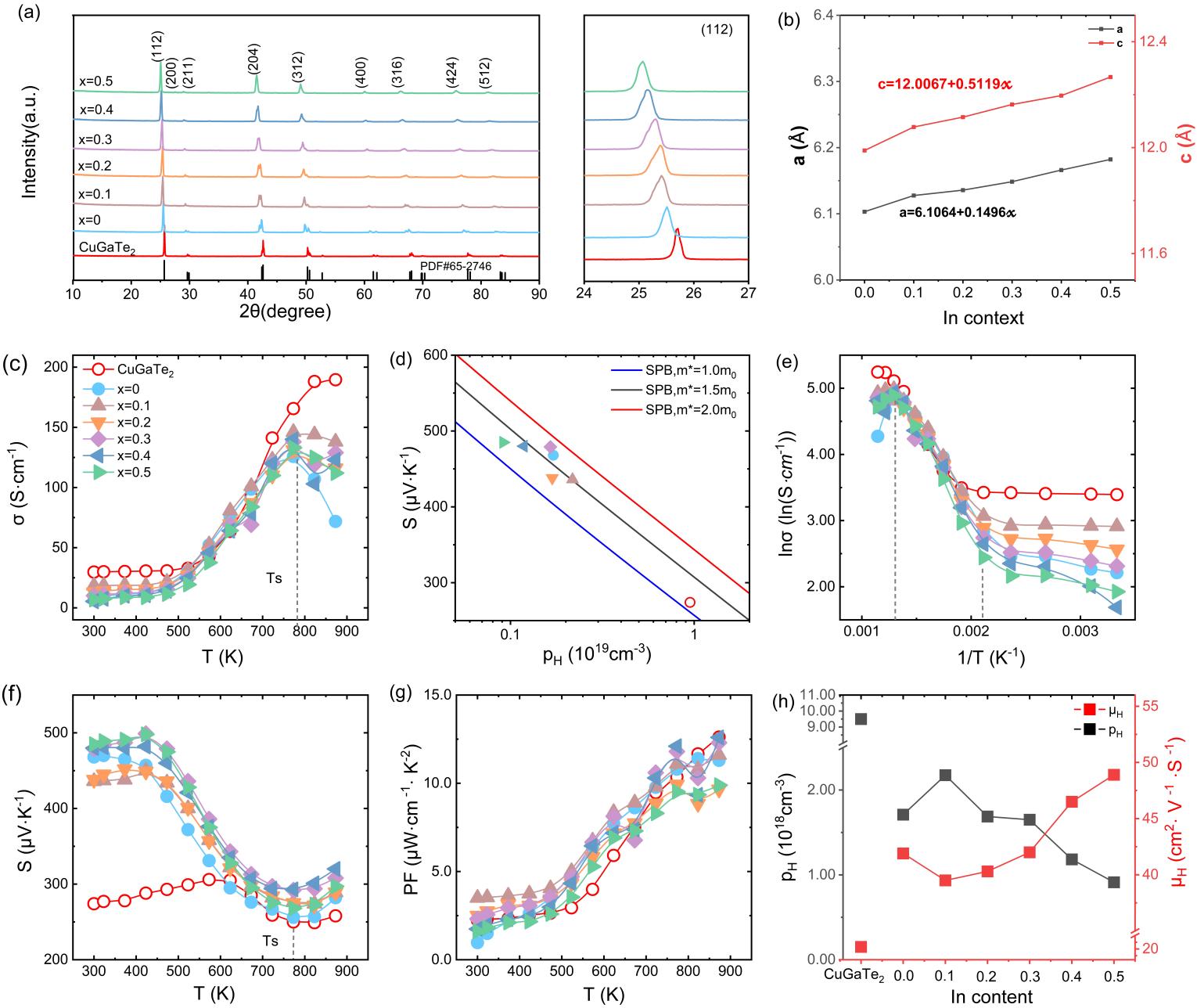 图1. (a)CuGaTe2与样品Cu0.7Ag0.3Ga1-xInxTe2(x=0-0.5)的X射线衍射图谱及放大(112)峰;(b)所有样品的晶格参数a和c;(c-h)纯CuGaTe2与Cu0.7Ag0.3Ga1-xInxTe2(x=0-0.5)样品的温度依赖性电输运特性:(c)电导率,(d)塞贝克系数与载流子浓度的皮萨连科关系,(e) lnσ 随1/T变化的曲线,(f)塞贝克系数,(g)功率因数,(h)x=0.1-0.5室温载流子浓度与迁移率
