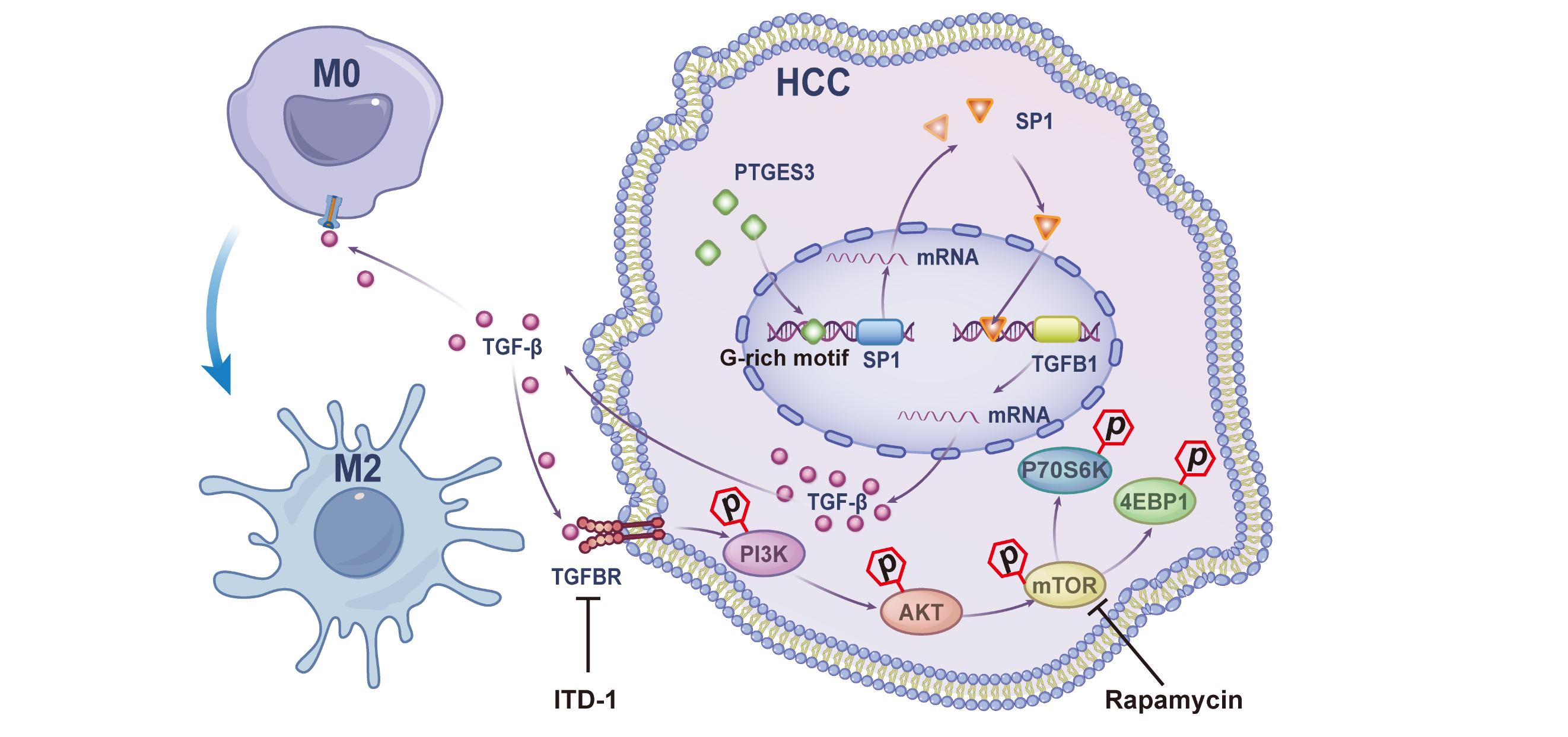 研究团队通过多个公共数据集和临床标本验证,确认PTGES3在肝癌中显著高表达并与患者不良预后独立相关。功能实验表明,PTGES3通过PI3K/AKT/mTOR通路促进肝癌细胞增殖与迁移。在DEN诱导的肝癌模型中,通过感染肝细胞特异性AAV-TBG-shPtges3病毒,研究发现Ptges3敲低显著抑制肿瘤生长,单细胞RNA测序揭示其表达下调可重塑肿瘤免疫微环境,表现为巨噬细胞M2型极化受抑。机制上,研究团队整合CUT&Tag、EMSA、ChIP-qPCR和双荧光素酶报告基因等技术,发现PTGES3在核内直接结合SP1启动子G-rich基序驱动SP1转录,SP1进一步上调TGF-β分泌,一方面通过自分泌激活PI3K/AKT/mTOR通路维持肿瘤增殖,另一方面以旁分泌方式诱导巨噬细胞M2极化。值得注意的是,HSP90抑制剂无法逆转该效应,而TGF-β受体抑制剂可有效阻断,证实该功能独立于PTGES3的经典分子伴侣活性。