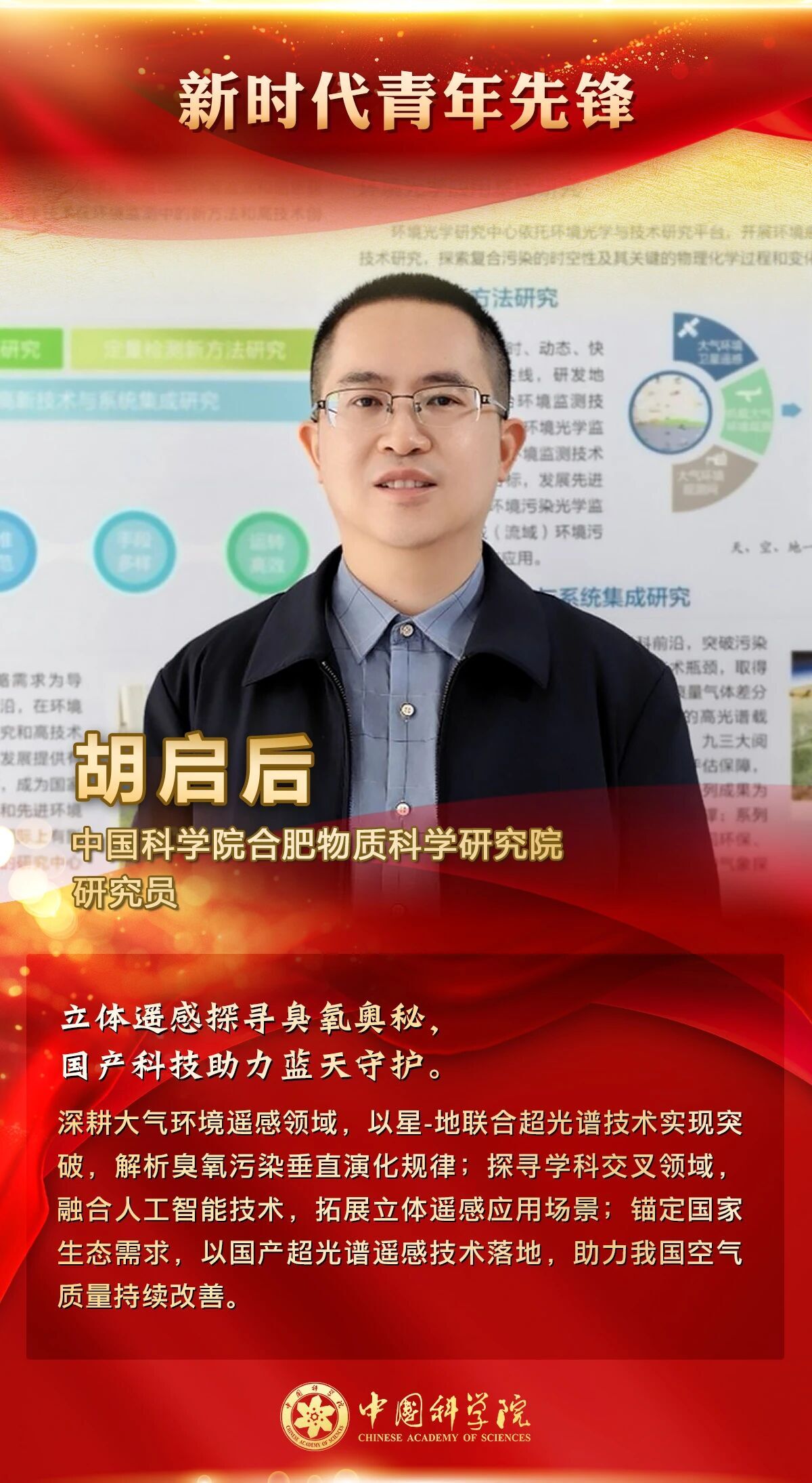 作为大气环境领域的青年科研骨干,胡启后长期从事大气污染超光谱立体遥感和立体监测数据人工智能解析相关研究,瞄准污染物垂直演化、高空传输定量评估等大气污染防治中的关键科学难题,研发了臭氧无盲区垂直廓线超光谱遥感探测技术、基于立体遥感观测的大气污染三维重构技术,并将国产超光谱技术成果应用于我国大气环境治理工作,助力空气质量持续改善。