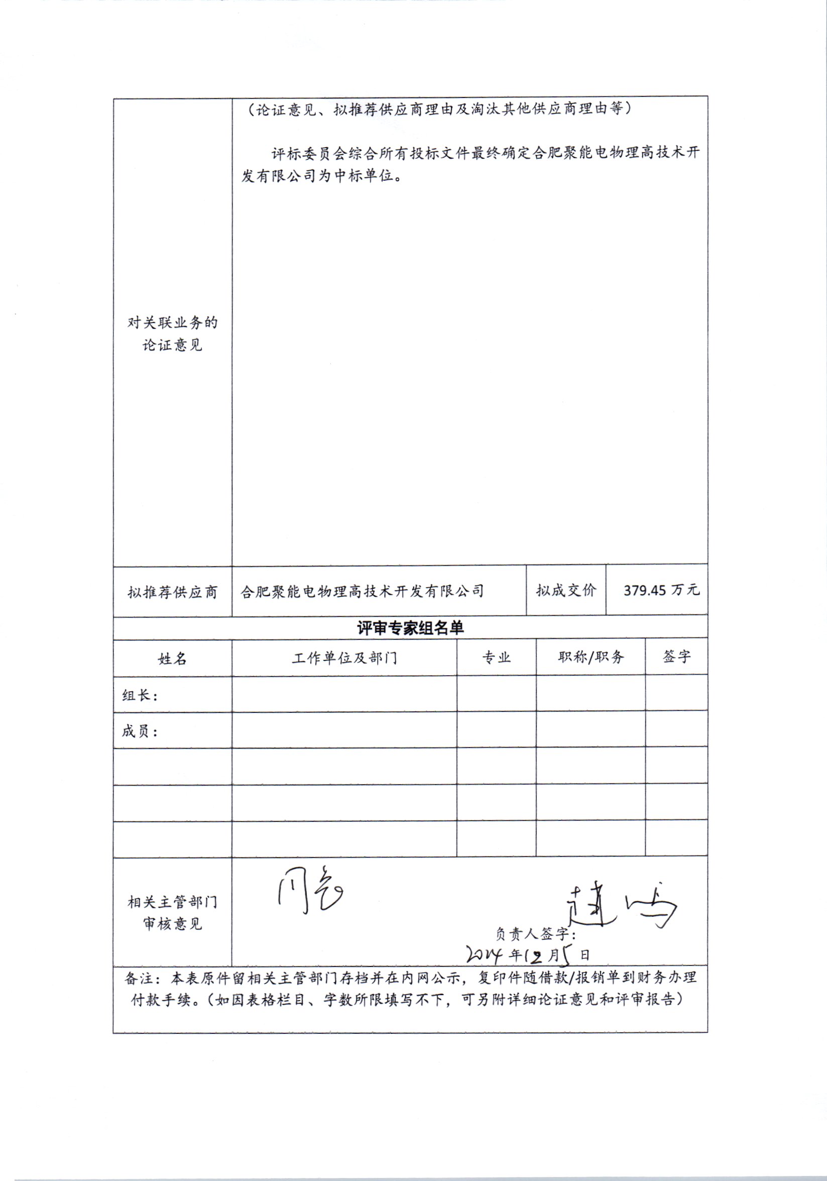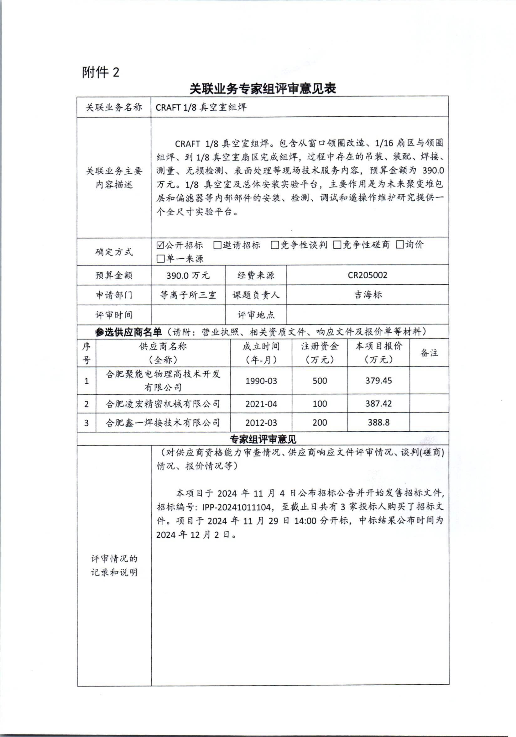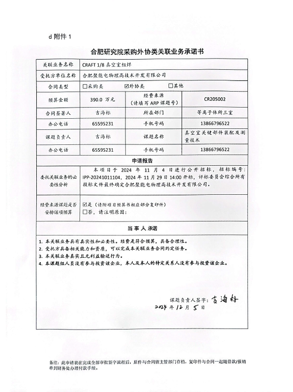 根据《中国科学院关于加强科研项目关联业务管理的暂行规定》(科发条财字〔2015〕125号)、《中国科学院合肥物质科学研究院关于加强科研项目关联业务管理的实施细则》(科合院发资字〔2021〕8号)、《合肥研究院加强关联业务管理暂行办法》(科合院发资字〔2022〕1号)要求,现就我院委托合肥聚能电物理高技术开发有限公司进行CRAFT 1/8真空室组焊项目进行关联业务公示。