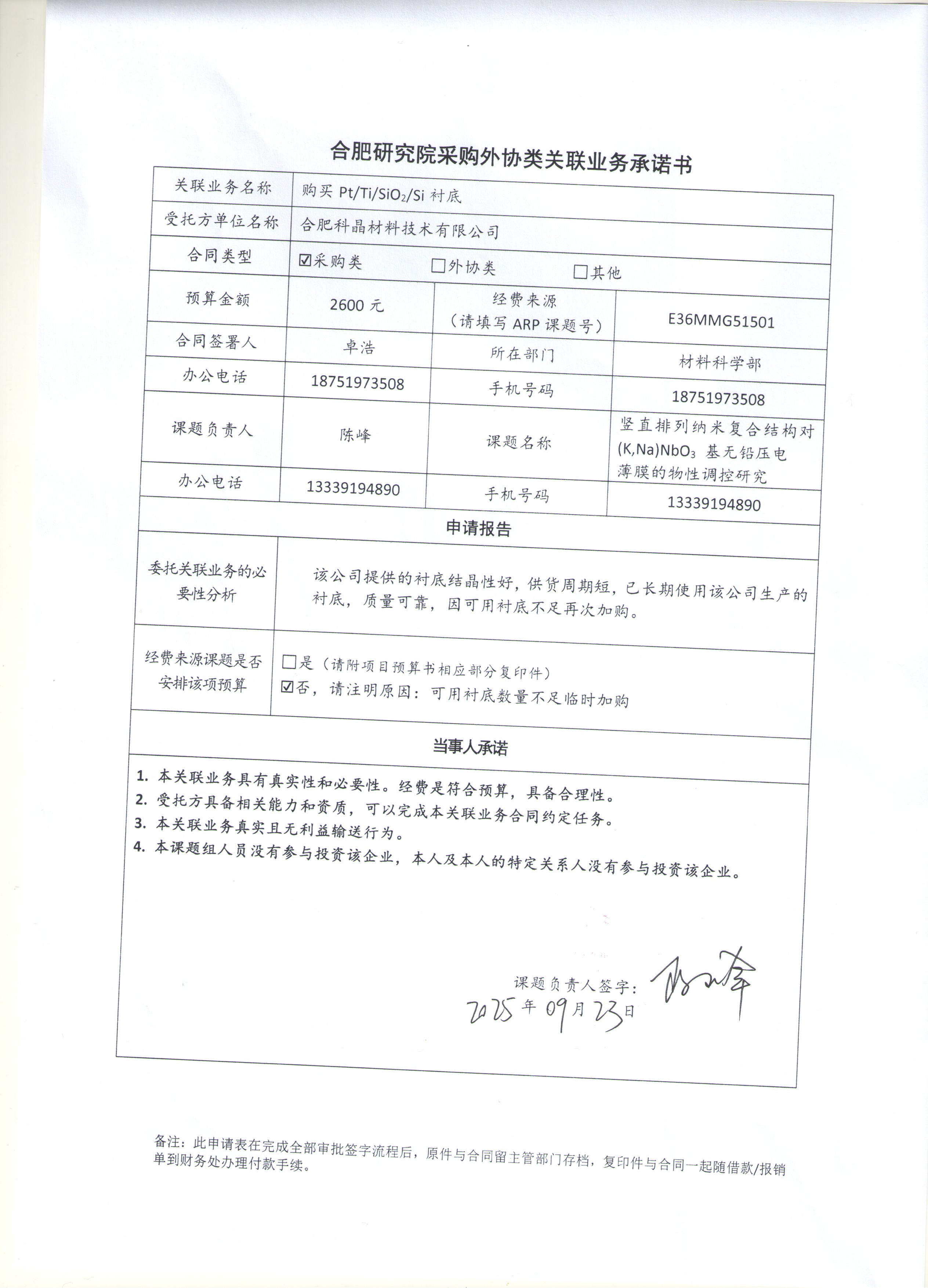 根据《中国科学院关于加强科研项目关联业务管理的暂行规定》(科发条财字〔2015〕125号)、《中国科学院合肥物质科学研究院关于加强科研项目关联业务管理的实施细则》(科合院发资字〔2021〕8号)、《合肥研究院加强关联业务管理暂行办法》(科合院发资字〔2022〕1号)、《合肥物质院加强关联业务管理补充规定》(科合院发资字〔2025〕1号)要求,现就我院向合肥科晶材料技术有限公司采购Pt/Ti/SiO2/Si衬底进行关联业务公示。